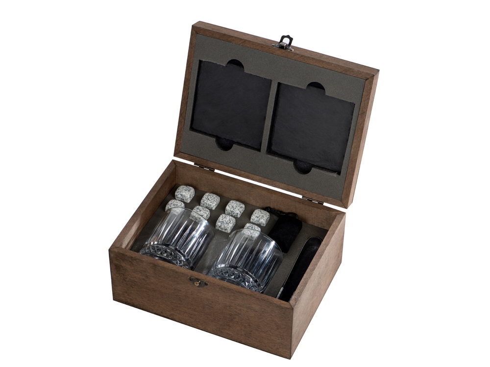 Набор для виски Jack состоит из двух стаканов с толстым дном, охлаждающих камней в мешочке, удобных щипцов и двух лаконичных костеров из сланцевого камня. Сет упакован в деревянную подарочную шкатулку, которая создает праздничное настроение еще до того, как вы откроете крышку. Более того, это уже готовый набор для подарка.