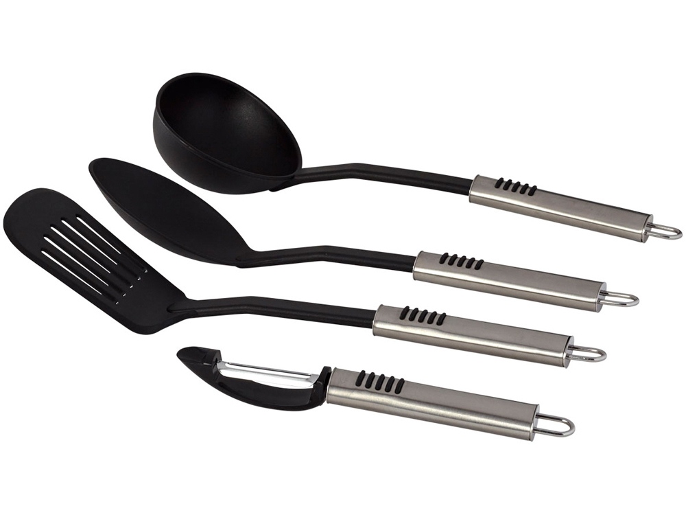 Кухонный набор из 4 предметов. Облегченный набор из четырех предметов включает чистильный нож, ложку, лопатку для сковороды и половник. Отверстия в ручках - для возможности повесить в кухне. Набор упакован в коробку Paul Bocuse. Нержавеющая сталь и нейлон. Гравировка (оптоволоконный лазер) (Без чернения) на данный товар осуществляется бесплатно. Оплачивается только настройка оборудования в размере 1100 рублей на весь тираж.